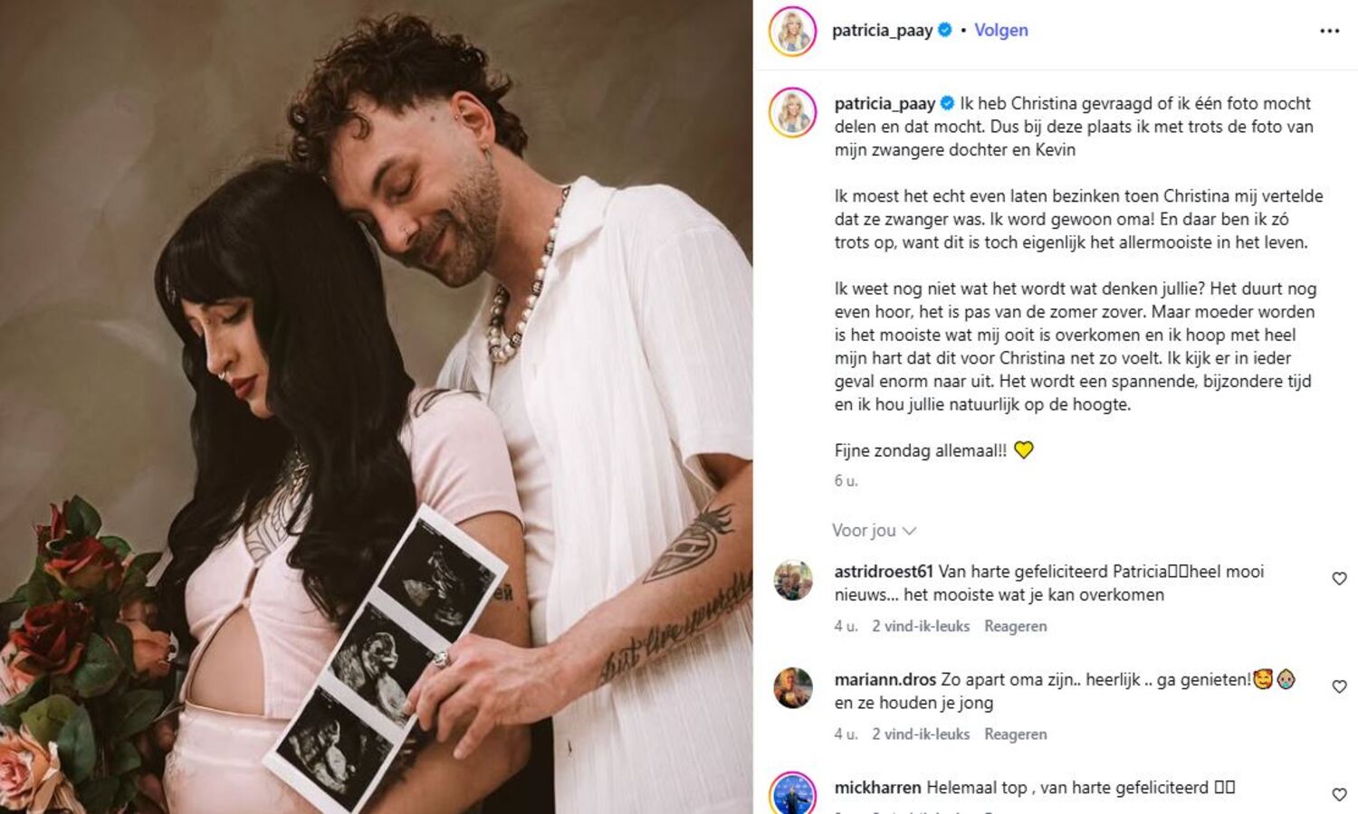 Zo bijzonder en zo mooi dat mijn eigen dochter nu ook moeder wordt.” Patricia laat weten dat het goed gaat met Christina en kijkt reikhalzend uit naar de komst van haar kleinkind.